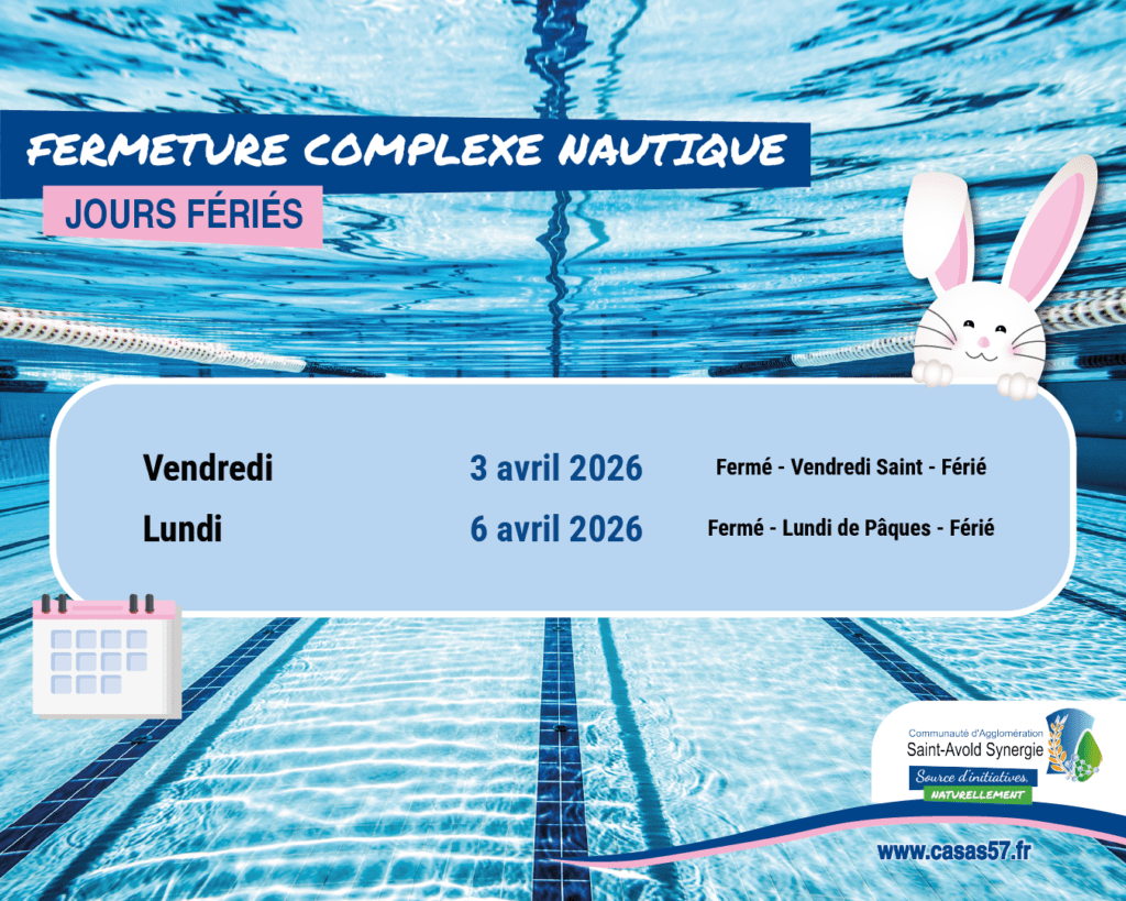 Le complexe nautique de Saint-Avold sera exceptionnellement fermé les vendredi 3 et lundi 6 avril, ainsi que le week-end.