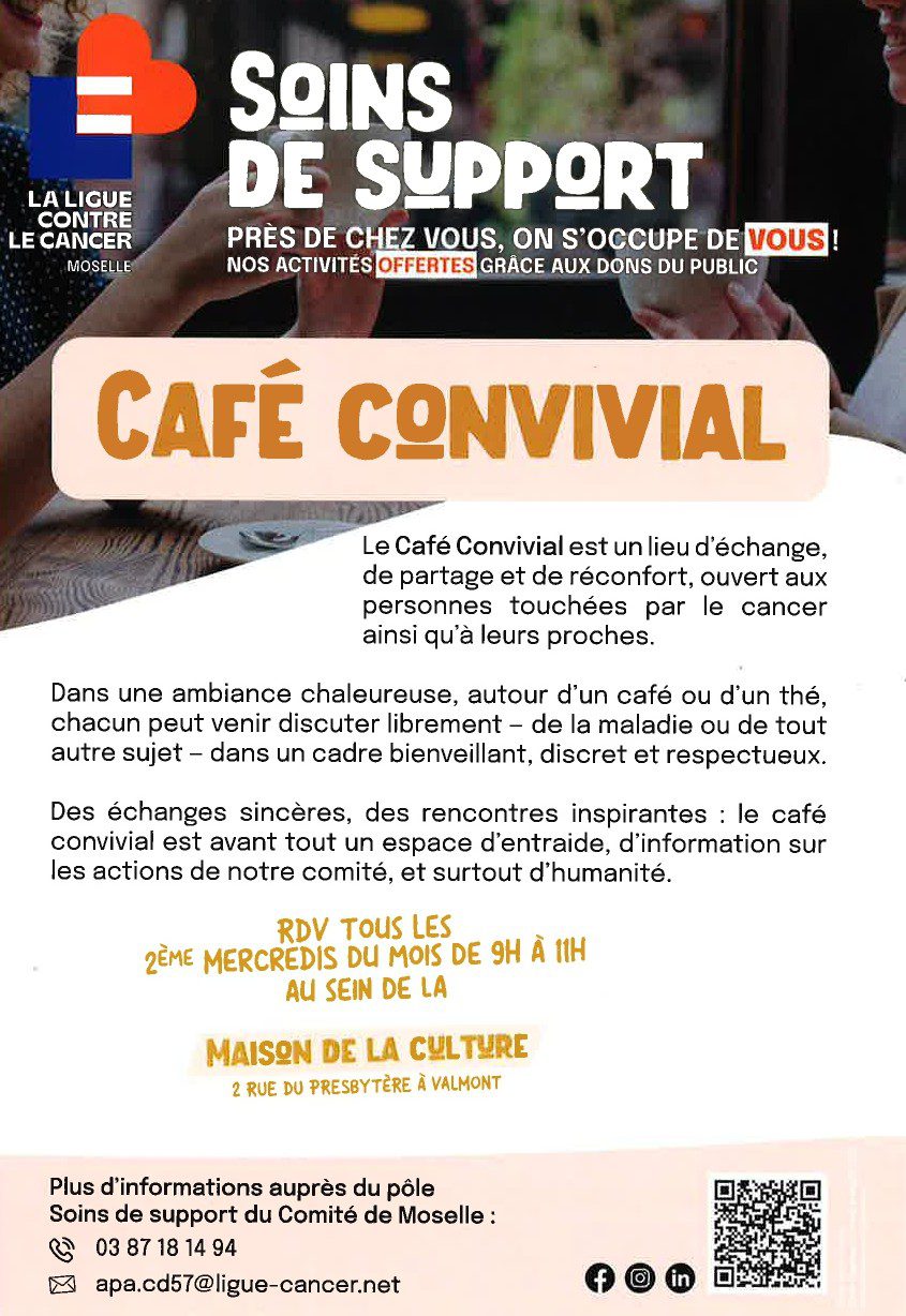 La ligue contre le cancer organise un café convivial tous les 2ème mercredis du mois de 9h à 11h à la Maison de la culture (2 rue du presbytère à Valmont).
